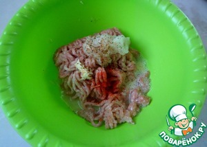 У меня готовый свино-говяжий фарш. Добавить к нему натертый лук репчатый, давленный чеснок, соль, 0,5. ч. л. паприки, острый перец, слегка взбитое вилкой яйцо. Хорошо перемешать, а затем отбить в миске. Накрыть пленкой "в контакт" и поставить в холодильник.