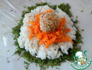 На квадрат пищевой пленки выложить рис по 50- 70г, разровнять его, затем сверху разложить морковь отварную и мясной шарик, поперчить свежемолотым перцем. При помощи пленки, слегка сдавливая, формировать шарик. Размеры шариков могут быть разные.
