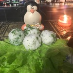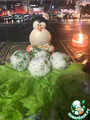 Для зеленого шарика нарезать мелко зелень укропа, разложить на пленке, а затем уже, как в первом случае: рис, морковь, мясной шарик, поперчить, скатать в шарик.