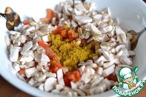 • Красный болгарский перец и шампиньоны мелко нарезать.