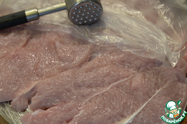 Прикрыть пленкой и слегка отбить. -