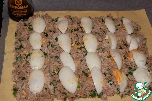 Разделить тесто на 2 части и раскатать каждую в прямоугольник 28х38 см. Выстелить поверх одной из частей теста начинку, оставляя со всех сторон по 3-4 см. Поверх начинки по меньшей стороне прямоугольника, поместить четвертинки яиц, которые тоже слегка подсолить и поперчить.