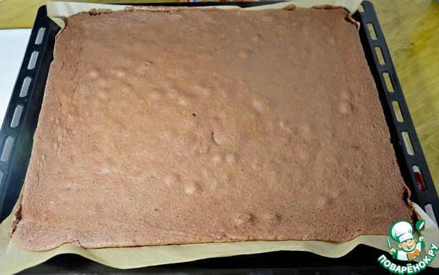 Готовый корж снять с противня вместе с бумагой, накрыть сверху полотенцем, дать остыть минут 40-60. -