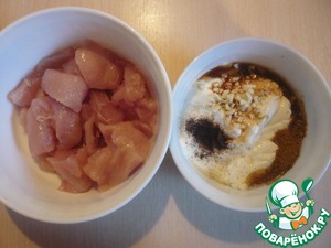 Филе нарезаем средними кусочками. Чеснок измельчаем и смешиваем с