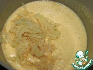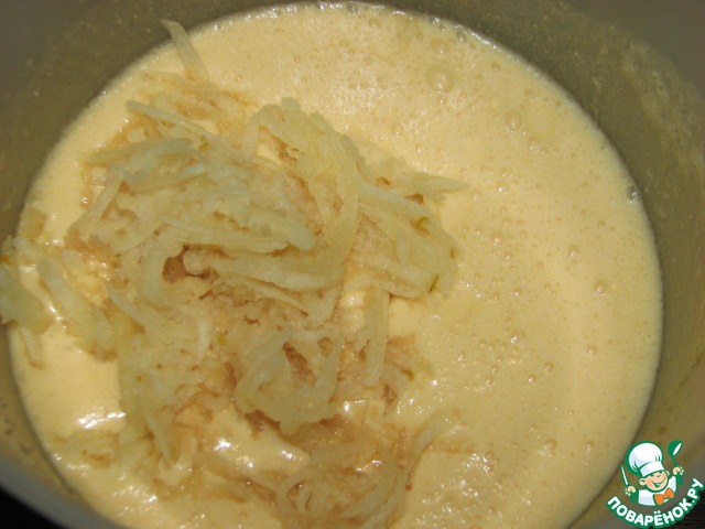 Грушу очистить от кожуры, удалить сердцевину, натереть на крупной терке, отжать. Выложить в тесто, перемашать.