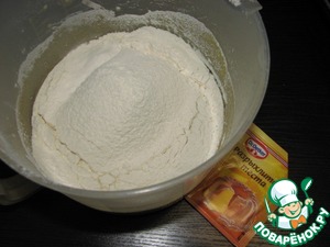 В массу просеять муку с разрыхлителем. Быстро взбить.
