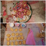 Перед выпечкой разделить тесто на 4 части, так удобнее раскатывать. Разомните его немного в руках. Раскатывать тесто, подсыпая чуть муки. Обрезки собираем и раскатываем. Для ровной раскатки теста, подложите с двух сторон шпажки или линейки одинаковой высоты, или спицы. Вырезать формочками печенье толщиной 0,5-0,6 см