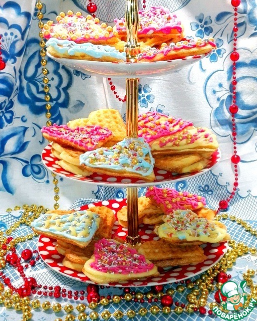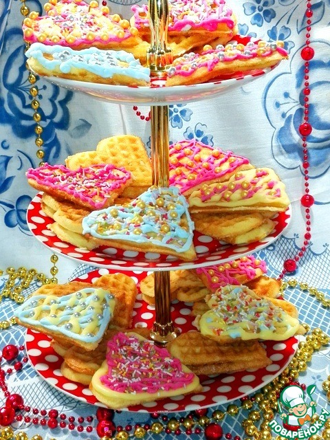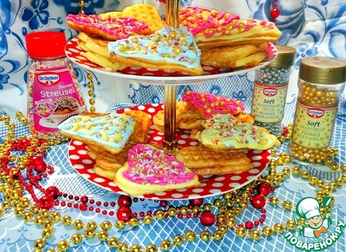 Вафли пекла я. Украшали их две сестрички, соседские внучки. Старшей сегодня День рождения, 10 лет. Вафли испекла и понесла девочкам. А они захотели их украсить. Часть вафель девочки украсили глазурью и посыпкой Dr. Oetker. Другую часть попарно они намазывали вареным сгущённым молоком и Нутеллой.