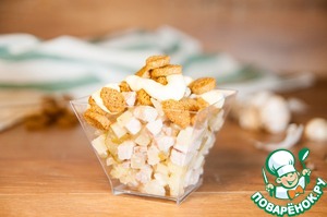 • Добавляем соль, перец, все хорошенько перемешиваем. Перед подачей добавляем в салат сухарики.