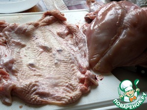 Тушку курицы промыть. Снять с курицы кожу целиком, отрезав крылья и вывернув ножки. Срезать мякоть с костей. Для этой руляды достаточно мяса с ножек и крыльев, грудку отложить для другого блюда.