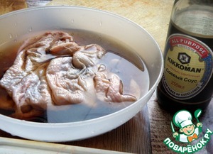 Положить кожу в ледяную воду с двумя ложками соевого соуса на полчаса.