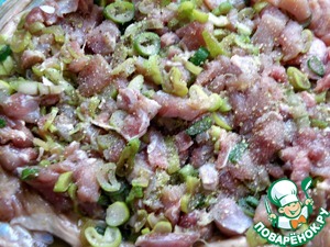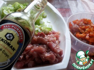 Срезанное мясо нарезать мелкими кубиками и разделить на две части. Добавить в бОльшую часть нарезанный порей, в меньшую- мелкие кубики сладкого перца. Влить в каждую часть по ложке соевого соуса и дать промариноваться с полчаса.