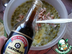 Яйца смешать с двумя ложками соевого соуса, добавить мелконарезанную грудинку и зеленый горошек. Выпечь омлет и остудить его.