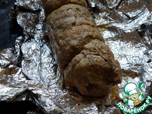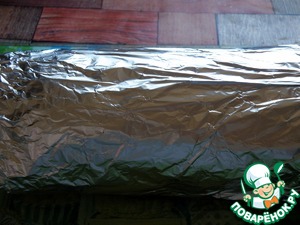 Завернуть плотно в три слоя фольги, закрутить края, стараясь посильнее уплотнить руляду. Далее уложить в подходящую посуду, налить на дно воды и запекать в духовке при 85 градусах в течении полутора часов.