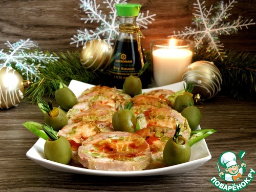 Нарезать руляду ломтиками и уложить на блюдо. При желании собрать оставшееся в фольге желе, растопить его, добавив по вкусу соевый соус, и полить руляду сверху. Украсить и подавать.