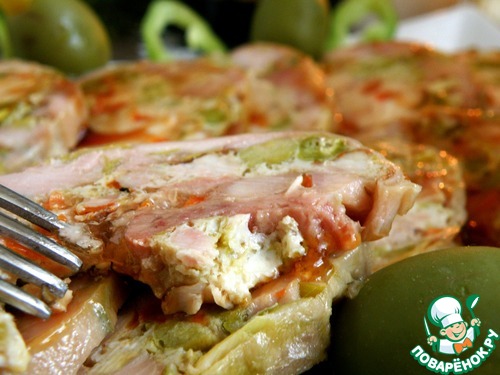 Выложить омлет. На него выложить мясо с перцем, так же посолить - поперчить и посыпать желатином.