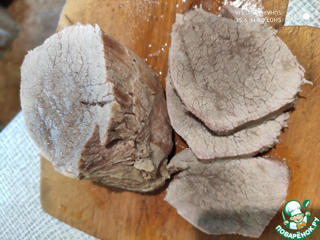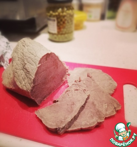 Готовое мясо оставляем остывать в бульоне, потом вынимаем, плотно заворачиваем в фольгу и убираем на ночь в холодильник.