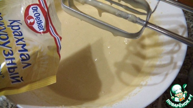 Взбить хорошо в однородную массу. Добавить муку и крахмал ( у меня от Dr.Oetker)
