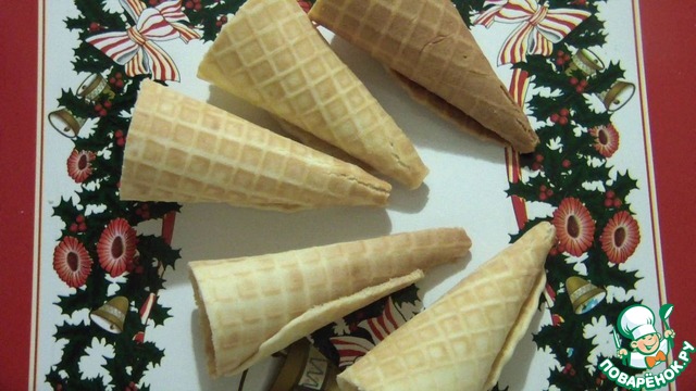 Для начала сделаем вафельное тесто. Либо можно купить готовые вафельные рожки. А для теста взобьём яйца с сахаром в густую пену, добавим растопленное сливочное масло.