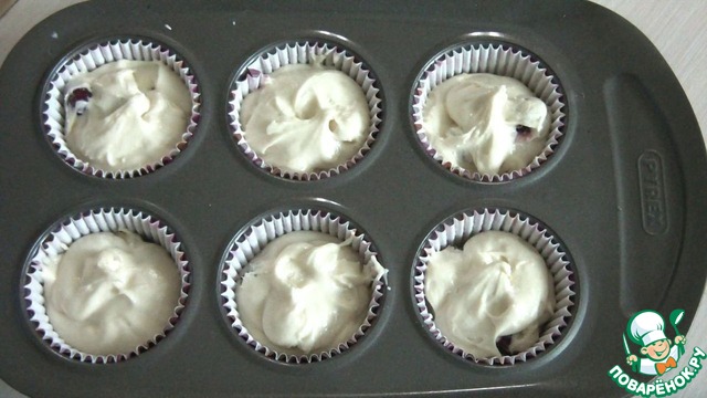 В последнюю очередь добавляем сухую смесь, перемешиваем до однородности. Тесто, как густая сметана. Добавляем замороженную или свежую клюкву, перемешиваем аккуратно. Раскладываем по формочкам, ставим на 180 градусов на 20-25 минут. Готовность проверяйте зубочисткой.