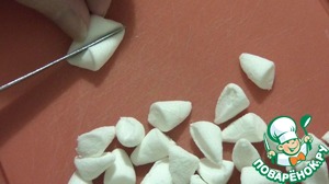Приготовим декор. Для этого маленькие маршмеллоу разрежем по диагонали. Обмакнём липкую сторону в сахар.