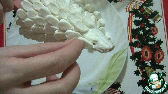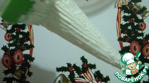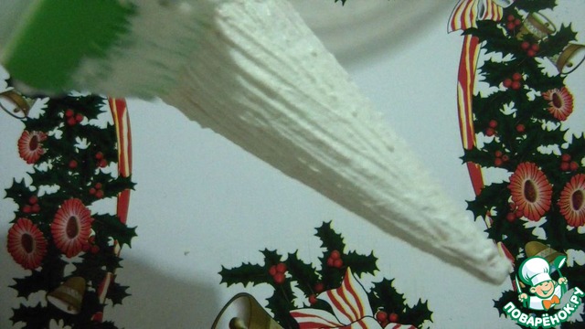 И самая кропотливая работа, прикрепить наши заготовки из маршмеллоу. Скрепляем так, чтобы сторона припорошенная сахаром была снаружи. Сахар будет сверкать при свете). Много крема на конусы добавлять не нужно, достаточно смазать кисточкой. Маршмеллоу отлично держатся! Также для декора использовала посыпку в виде жемчужин от Dr.Oetker