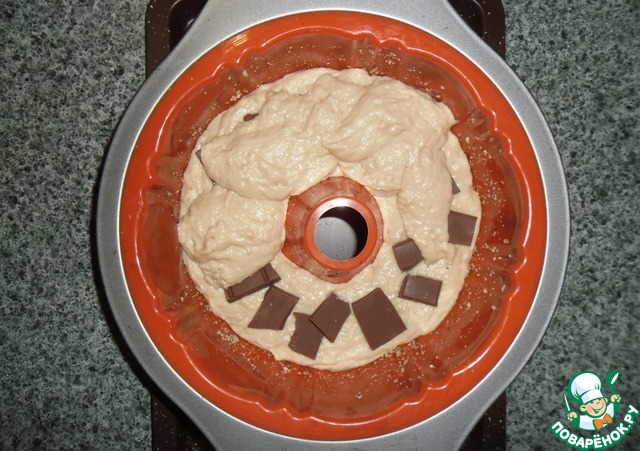 Вновь перебить тесто. Форму смазать маргарином, обсыпать молотыми орехами. Выложить половину теста в подготовленную форму. Сверху выложить ломтики шоколада. Ложкой выкладываем остальное тесто, выравниваем, оставляем подняться в тёплом месте. Духовку разогреть до 200 градусов. После подъема теста через 30-40 минут отправляем форму в духовку. Через 30 минут убавить температуру до 160 градусов, выпекать ещё 30 минут. Обязательно контролируйте процесс, т. к. духовки у всех разные, проверьте тесто на "сухую лучинку". Готовый пирог вынуть, слегка охладить, переложить из формы. Аромат пирога *лимон+ваниль+ром* -