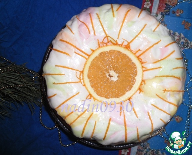 Сверху пирог украшаем. Можно посыпать тертым шоколадом, он немного подтает на тёплом маршмеллоу, забавно выглядит. Я украсила долькой и цедрой апельсина.