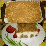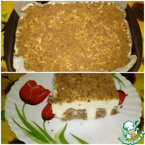Заливаем бисквит кремом, хорошо встряхивая, что бы он заполнил все отверстия. Сверху посыпаем бисквитной крошкой.