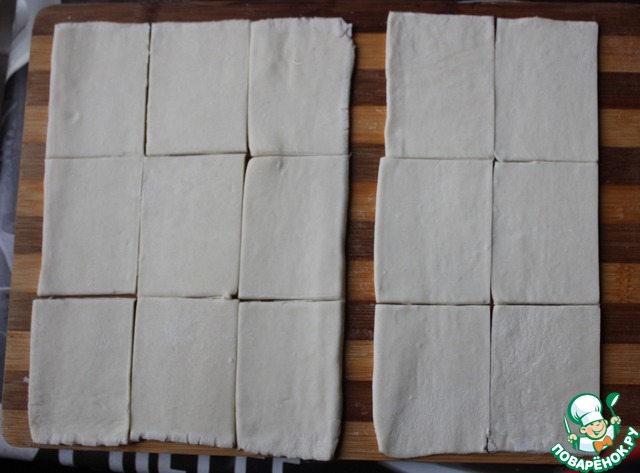 Тесто раскатываем, у меня получилось 2 прямоугольника 22х16 см. Нарезаем на прямоугольники размером примерно 7,5х5,5 см. Получается 18 прямоугольников, один откладываем.