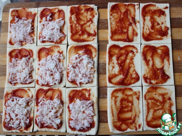 Остальные смазываем томатным соусом (кетчупом), выкладываем рис на 2/3 кусочка, присыпаем мелко натертым сыром.