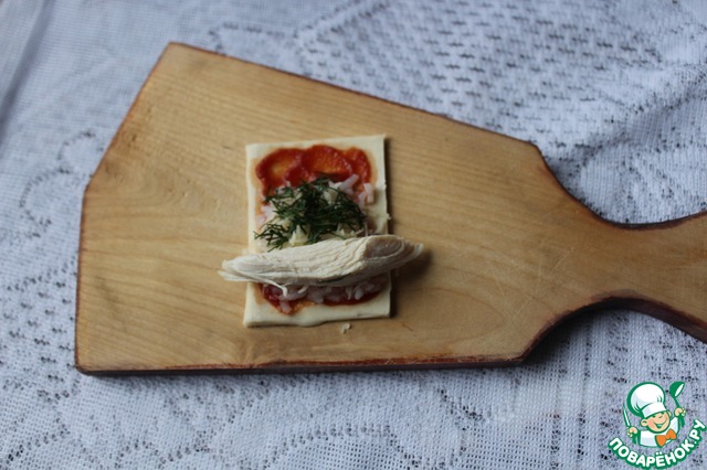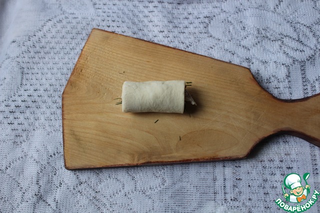 На короткую сторону каждого прямоугольника выкладываем кусочек мяса, присыпаем укропом