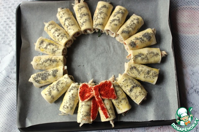 Смазываем желтком, присыпаем маком. Из оставшегося прямоугольника формируем бантик, смазываем желтком, посыпаем паприкой, слегка её прижимаем к тесту. Бантик переносим на наш венок.