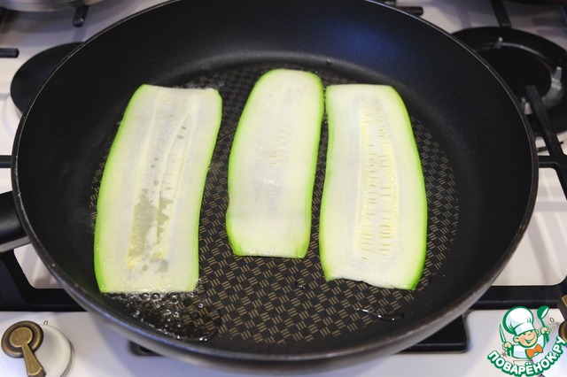 На сковороду добавить растительное масло (1 ст. ложка). Обжарить кабачковые слайсы с двух сторон в течение 1-2 мин.