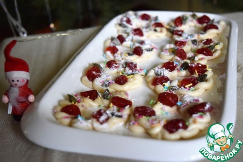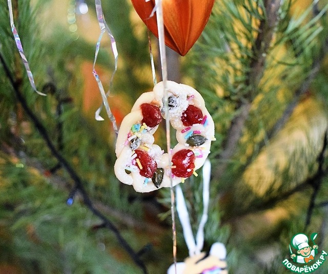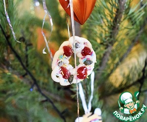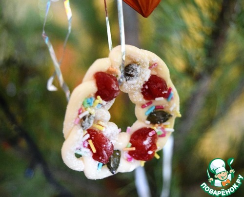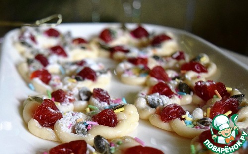 Я решила попробовать сделать конфетки в виде снежных венков, соединив в них самые новогодние цвета: зеленый (елка), красный (тулуп деда Мороза), белый (снег). Получилось, как мне кажется, нарядно. И вкусно: воздушно-жевательный шоколад (не знаю, как это обозначить по-другому) замечательно сочетается с кислинкой вишни и хрустящими тыквенными семечками. А посыпка «Dr. Oetker» добавила ярких красок.