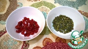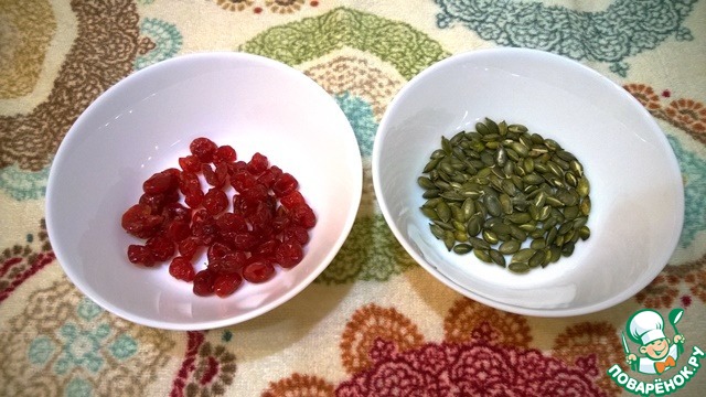 Подготовим вишню и тыквенные семечки. Вишню промыть, если необходимо и просушить. Семечки слегка поджарить на сковороде или в микроволновке, чтобы увеличились в размере и аппетитно запахли.