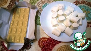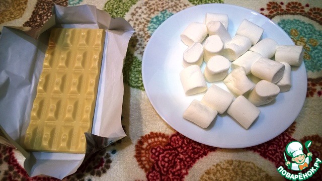 Маршмеллоу нужно взять немного меньше по весу, чем шоколада: на 1 г маршмеллоу 1,3 г шоколада. У меня на 40 г маршмеллоу 55 г шоколада.