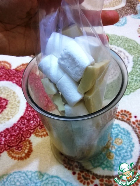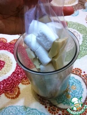 Поломать шоколад на мелкие кусочки, а маршмеллоу, если крупные, тоже порезать. Положить их вперемешку в одноразовый кондитерский мешок. Можно использовать и плотный полиэтиленовый пакет. Поместить мешок в емкость и залить горячей водой (только чтоб вода не попала в мешок). Время от времени разминать мешок, чтобы его содержимое хорошо перемешалось.