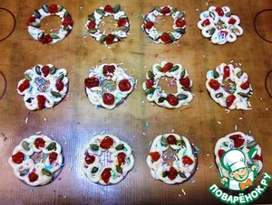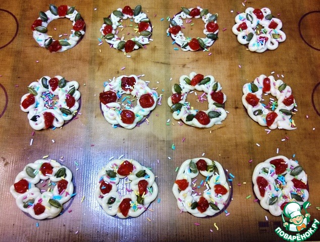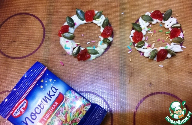 Отрезаем кончик мешка или пакета, чтоб получилось отверстие примерно 4-5 мм в диаметре (если меньше, труднее формовать и конфеты получаются тонкие и ломаются). И выдавливаем из мешка спиральки или волны, стараясь уложиться в круг и оставить в центре отверстие. Сразу же украшаем венок половинками вишни, тыквенными семечками и посыпкой «Dr. Oetker».