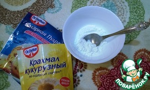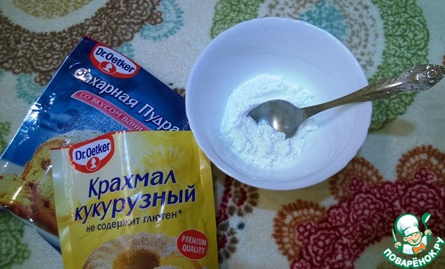 Готовые конфеты я отправила на полчаса в морозилку. Тем временем смешала кукурузный крахмал и сахарную пудру (на мои 12 штук хватило чайной ложки смеси). Вынув из морозилки затвердевшие конфетки, нужно их осторожно обвалять в смеси пудры и крахмала, чтоб придать еще более снежный вид и чтоб не прилипли к посуде, на которую вы их выложите.
