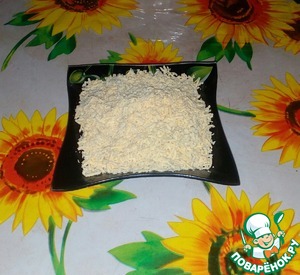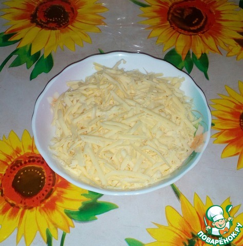 Трём желтки на мелкой тёрке и посыпаем верх салата.