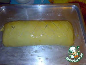 Сворачиваем рулетом, обмазываем желтком и ставим в духовку.