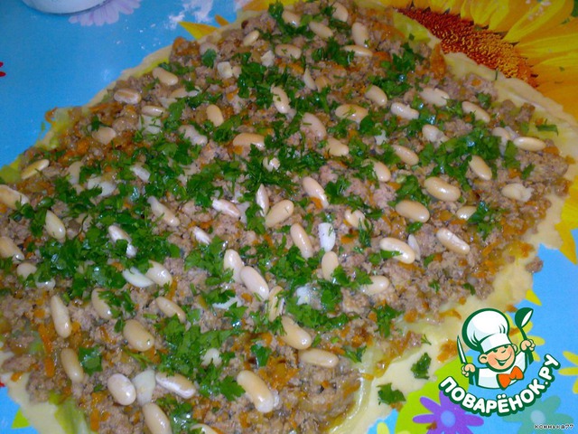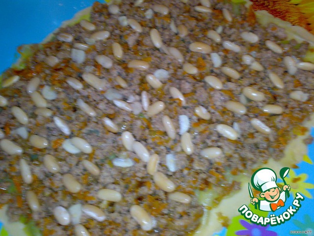 На фарш - фасоль (фасоль нужно не насыпать, а выкладывать ровными рядами). -