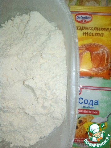 Муку просеять с содой и разрыхлителем теста. Я использую продукцию ТМ "Dr.Oetcker".