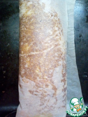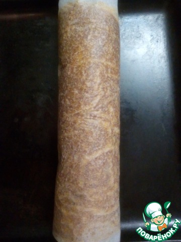 Готовый рулет достать из духовки и остудить 5-10 минут. Затем аккуратно свернуть в рулет вместе с пергаментом. Оставить в таком виде на 20 минут.