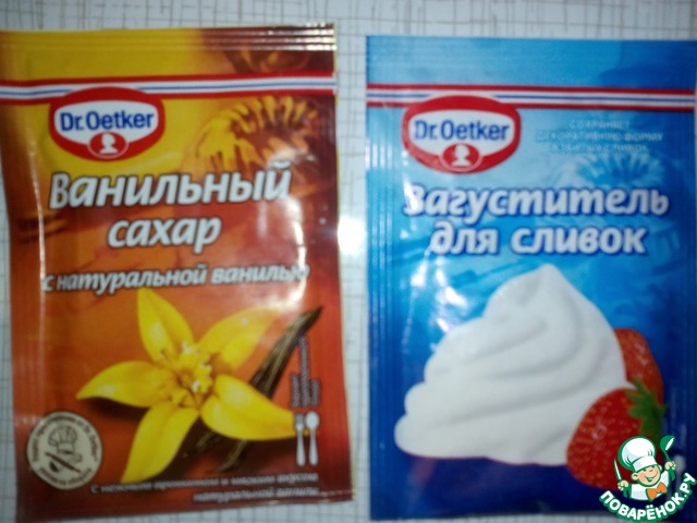 В это время готовим крем. Для этого понадобятся ванильный сахар и загуститель для сливок ТМ "Dr.Oetcker".