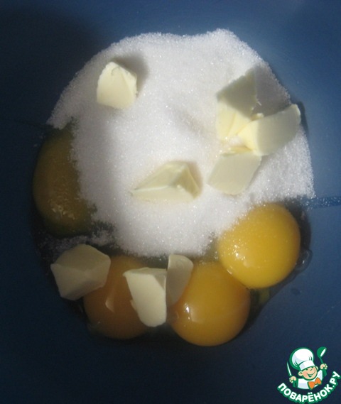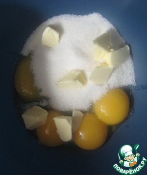 В отдельной миске растереть сахар, желтки и мягкое сливочное масло.