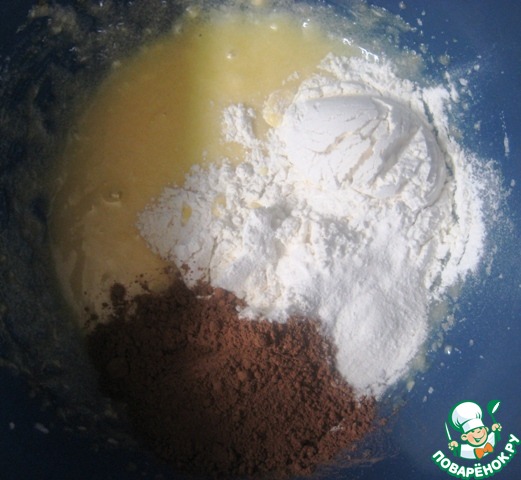 Добавить муку, разрыхлитель теста и какао.