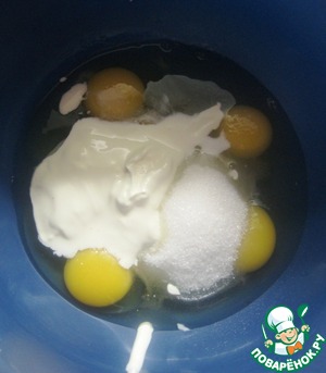 Яйца, сметану, сахар и растительное масло соединить в миске. Перемешать.