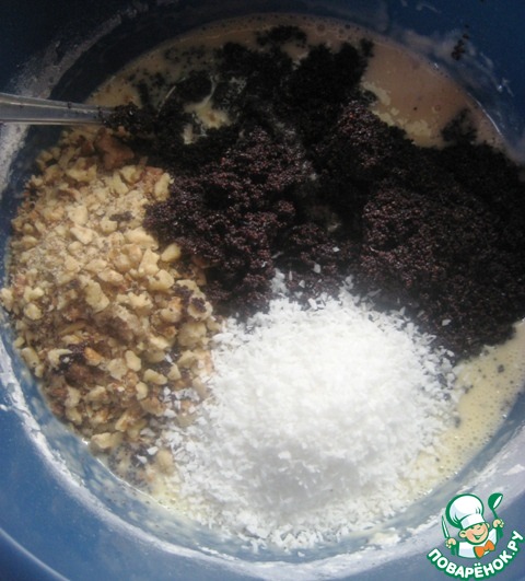 Всыпать измельченные орехи, мак и кокосовую стружку.